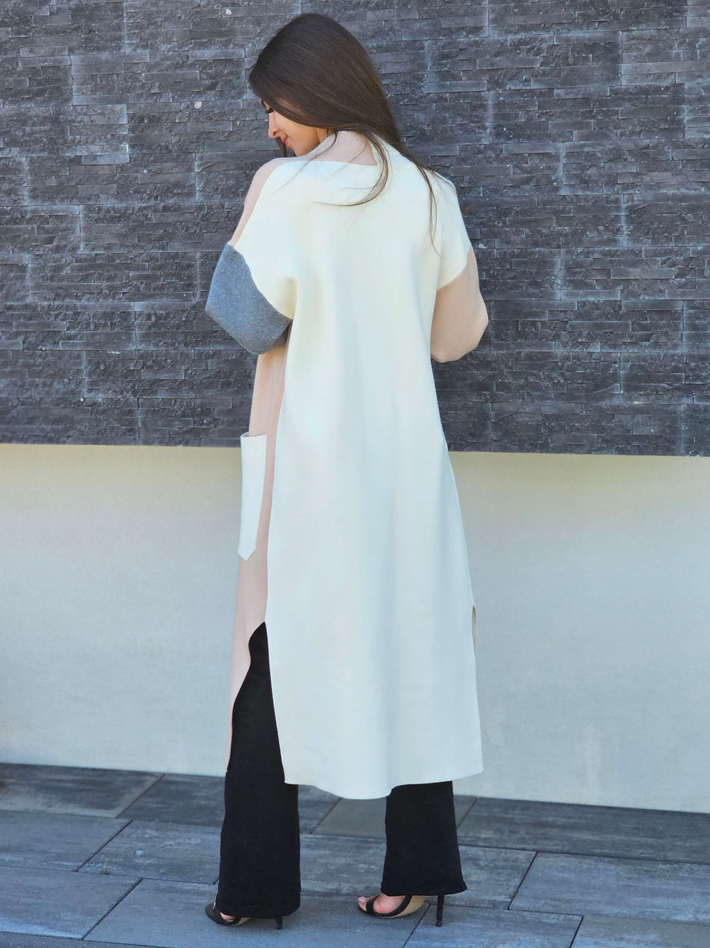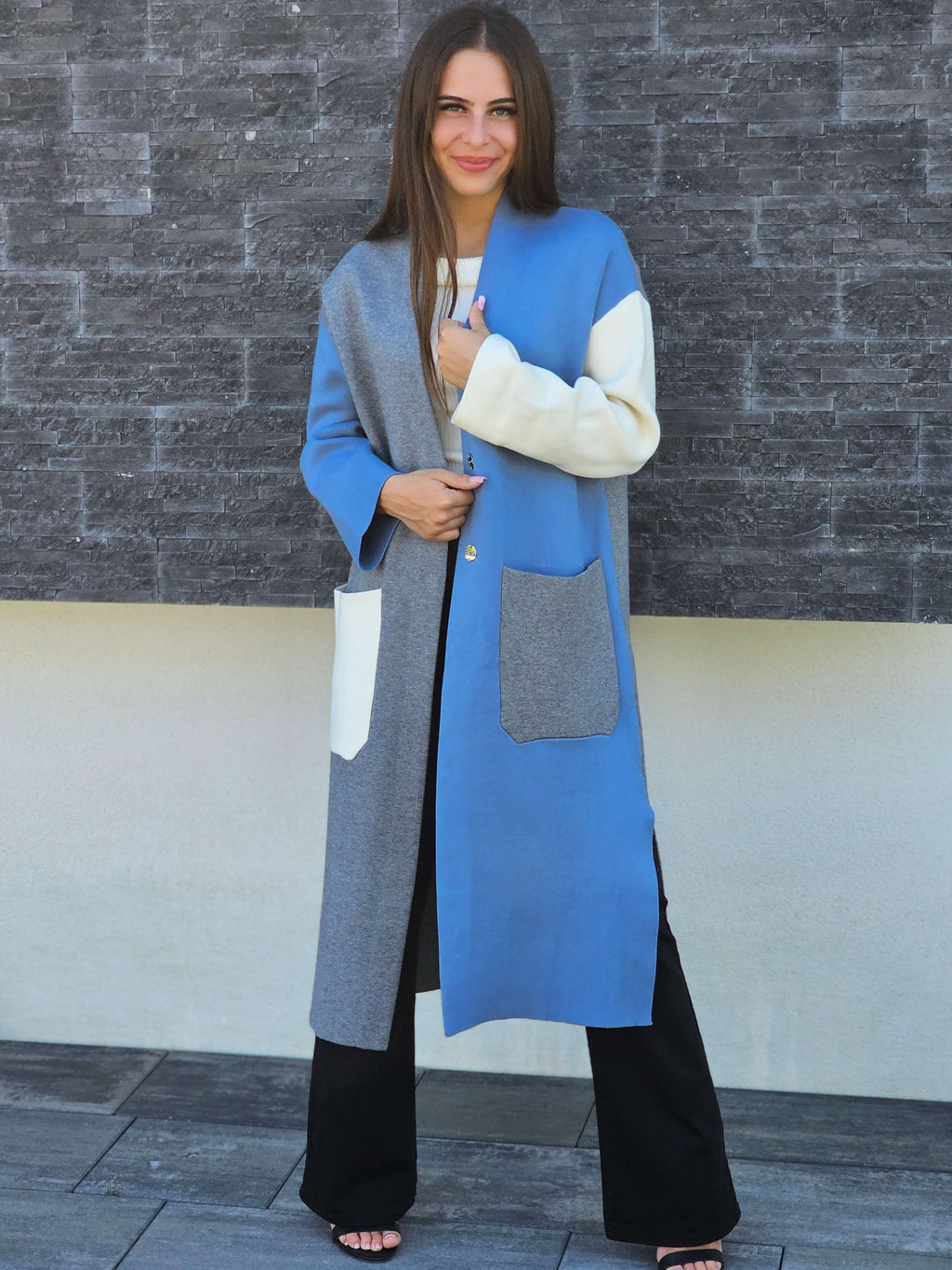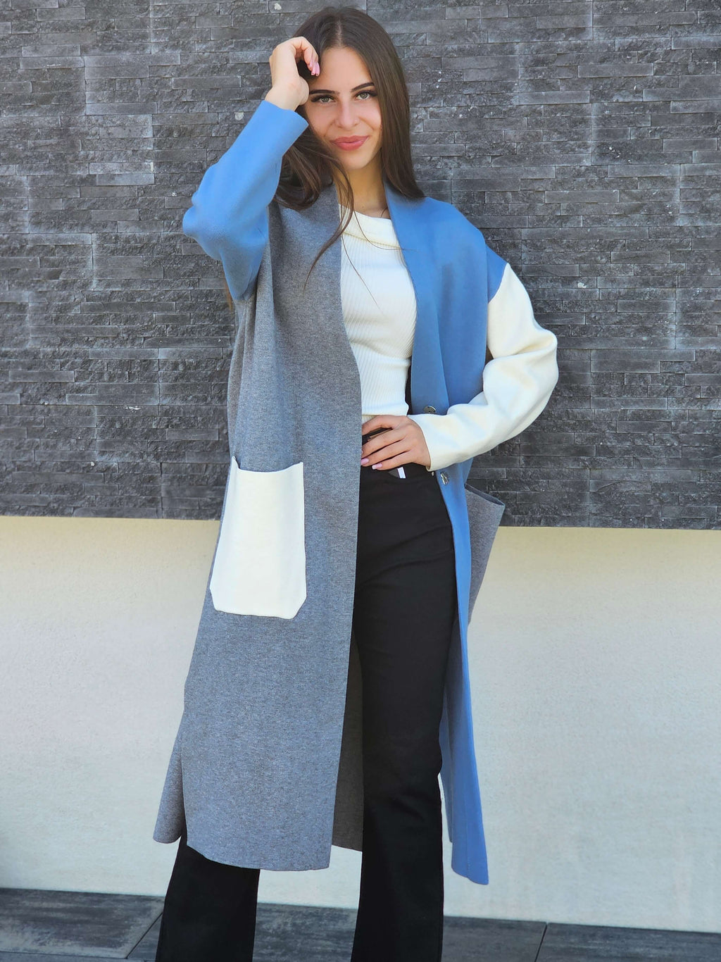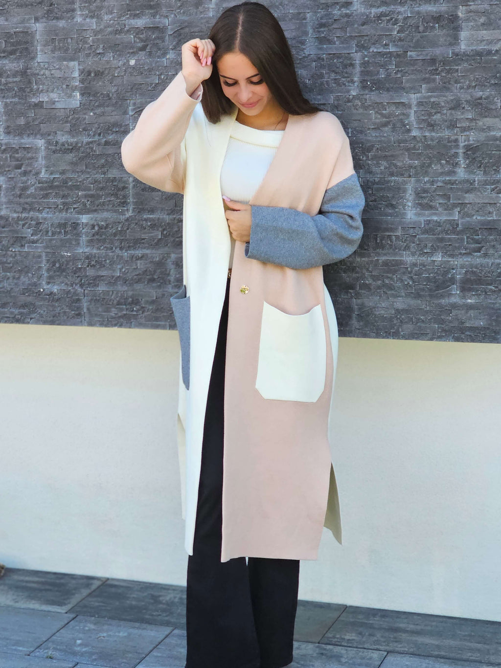 Ten kardigan to prawdziwy must-have na chłodniejsze dni. Połączenie pastelowych i stonowanych barw sprawia, że pasuje zarówno do klasycznych stylizacji, jak i do codziennych, luźnych outfitów. Długi fason pięknie wydłuża sylwetkę, a praktyczne kieszenie dodają mu funkcjonalności.