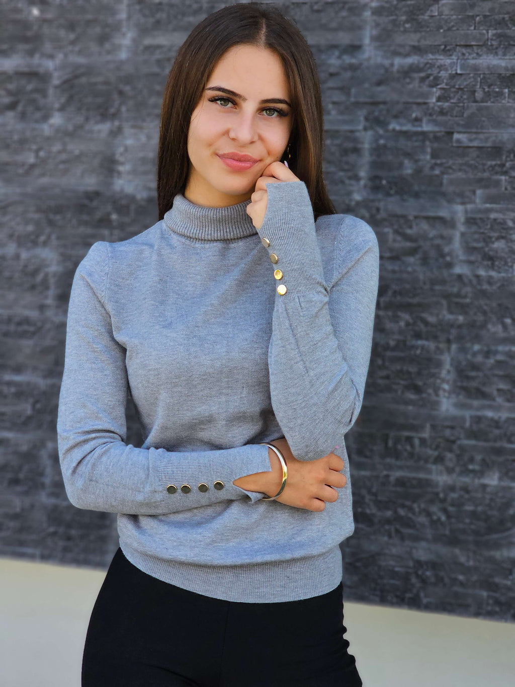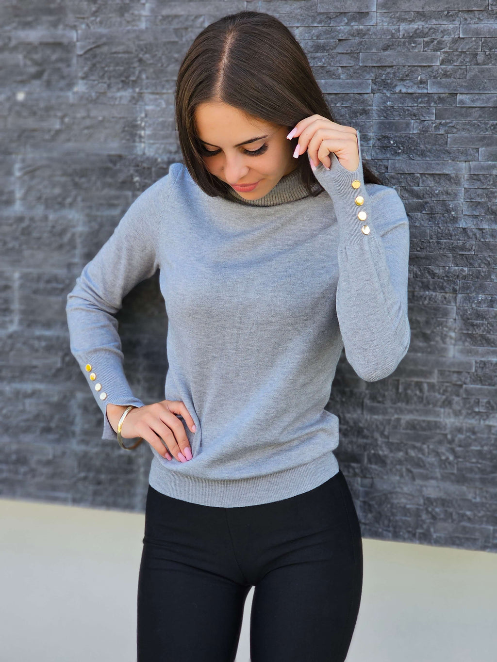 Szary sweterek z ozdobnymi guzikami – klasyka w nowoczesnym wydaniu